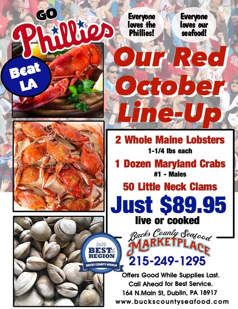 Excitement reigns as Red October hits the region. We've got a dinner special that's perfect for the 6 or 6:30 Phillies start on Saturday: 2 lobsters, a dozen crabs and 50 little necks. All live or cooked for just $89.95. Live large at a great price. Please call in advance so we can everything ready for you. 215-249-1295. And we've got all your favorite seafood for the Eagles at 1 on Sunday. Stop by or call your orders in. Enjoy!