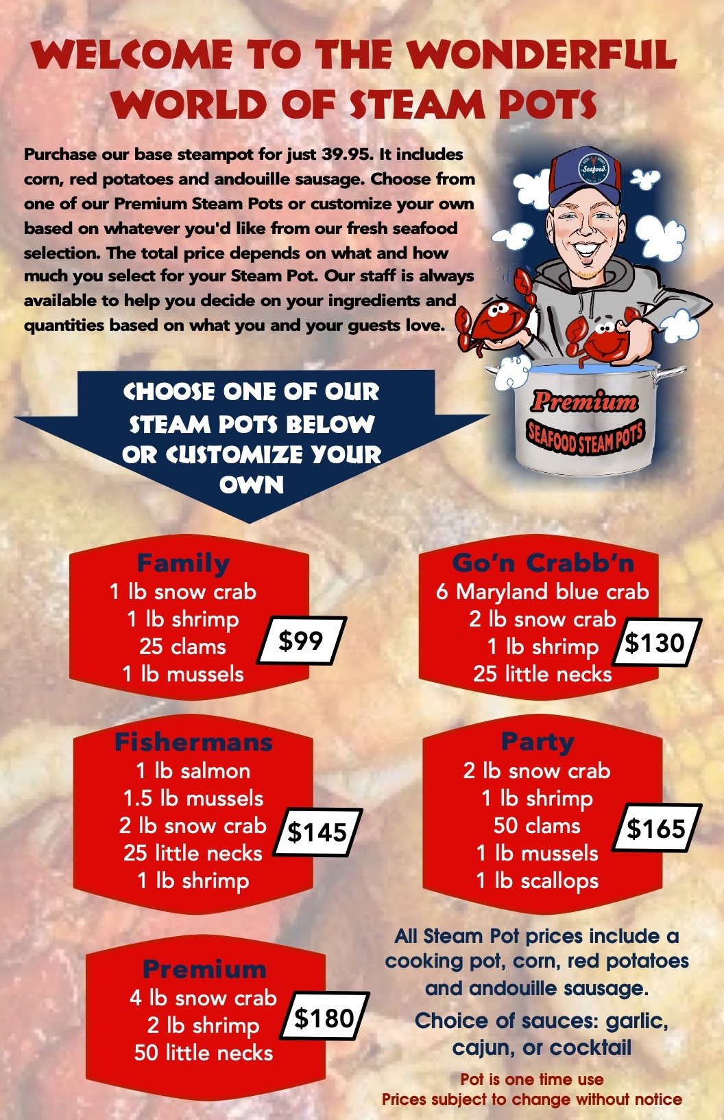 Our Steam Pots serve 2 - 8 people. Prices subject to market fluctuations and may change without notice. Some items may not be available due to market conditions. Best to call in advance for selection and latest inventory.